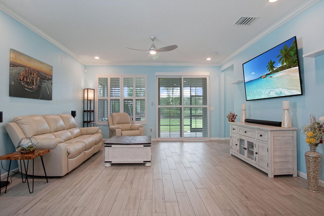 Endless natural light and low maintenance single-level living designed for comfort, style, and easy entertaining. Nearly new (2020), this elegant CBS home showcases plank tile throughout the main areas, luxury vinyl tile and crown molding in the master suite, and plantation shutters throughout. The chef-ready kitchen features matching Whirlpool stainless appliances, a convenient gas range, a large quartz island, upgraded cabinets with decorative-trim, a walk-in pantry, disposal and a tasteful tile backsplash. Simply perfect for intimate dinner parties or casual weekend mornings. Relax in a serene master suite boasting a massive walk-in closet with customer organizers and a dual-sink quartz vanity. The guest bathroom offers a beautiful granite vanity. Thoughtful touches include impact windows and doors, ceiling fans with lights in every room, a two-car garage with epoxy floor, laundry with loads of storage, crown molding throughout the main and bedrooms, and a durable stucco exterior with gutters and concrete soffits. Outdoor living at its best with both a covered paver porch and rear screened patio. Additional exterior features include privacy bushes lining the rear property line, a sprinkler system and sidewalks throughout the community. The HOA enhances lifestyle with a pool, fitness center, tennis and basketball courts, BBQ picnic area, dog park, included lawncare, Wi Fi and cable-ideal for active couples who value convenience, amenities and entertaining. Schedule a showing and picture evenings at home and weekends spent relaxing and exploring the community.