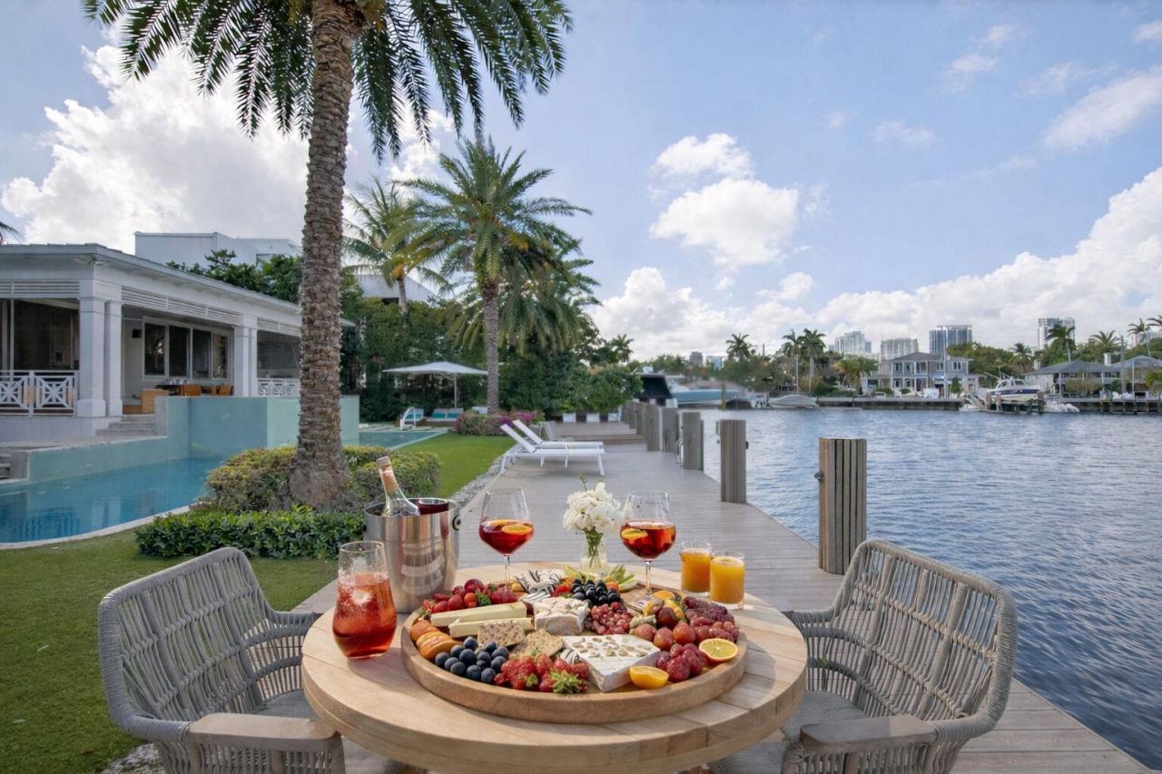 An exceptional waterfront estate in the coveted Rio Vista neighborhood of Fort Lauderdale, this residence is set along a rare, one-of-a-kind wide-body canal, offering an unparalleled sense of openness and privacy. With 100 linear feet of deep-water frontage and a private dock, it presents an extraordinary opportunity for the discerning buyer seeking a life defined by water, light, and refined living. Set on an expansive 12,500 square-foot lot, the property features a seamless indoor-outdoor lifestyle with pool, spa, covered loggia, and direct Intracoastal access-all framed by lush tropical landscaping and towering palms.