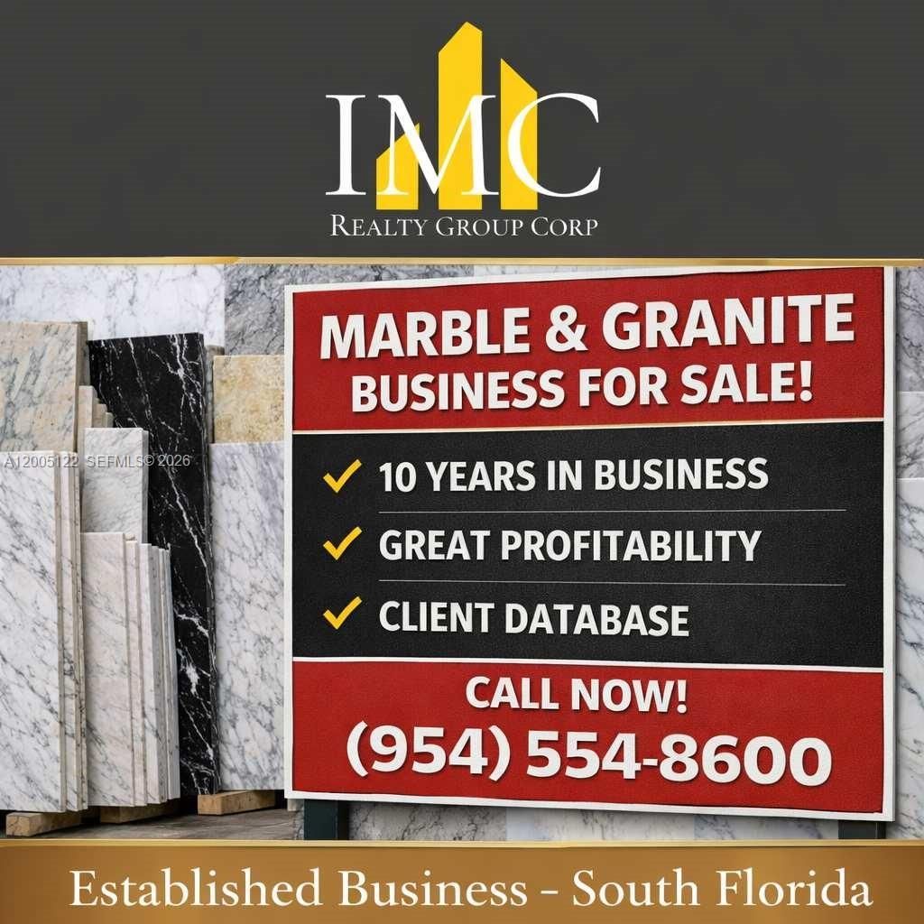 Business For Sale-Well-established and highly profitable marble and granite retail and Wholesale company with 10 years in business and a solid, loyal client base. Fully equipped for in-house fabrication, supported by a skilled team of 14 employees. The company services a wide range of account clients, including builders, general contractors, cabinet dealers, millwork shops, and designers. The business operates from a great location with over 3 years remaining on the lease and an option to renew, offering stability and room for continued growth. This is an excellent opportunity for a qualified buyer looking to acquire a turnkey, reputable, and income-producing operation in the stone industry. Information herein is believed to be accurate, but its not guaranteed, should be independently verified for accuracy, and may be changed without notice.